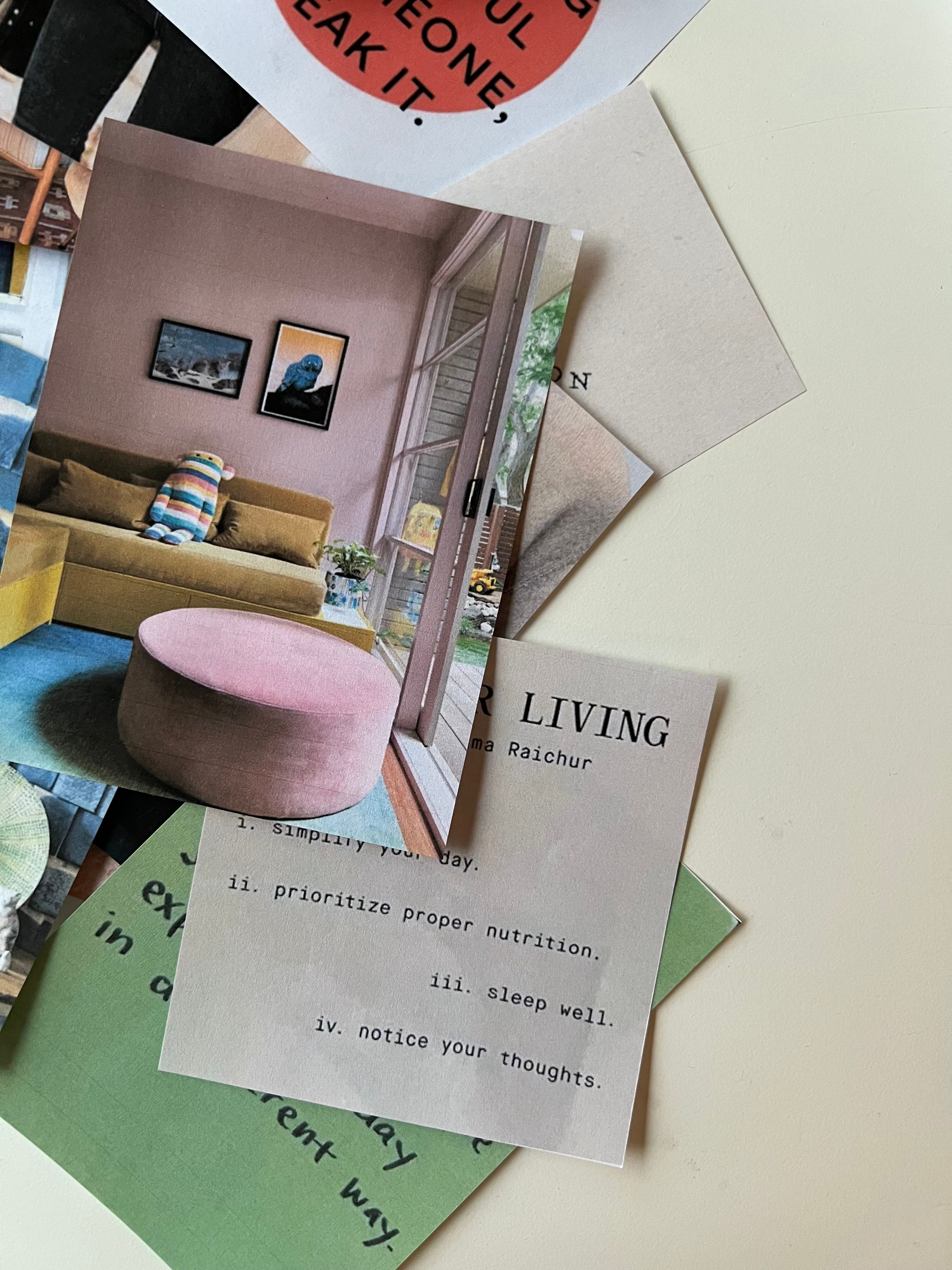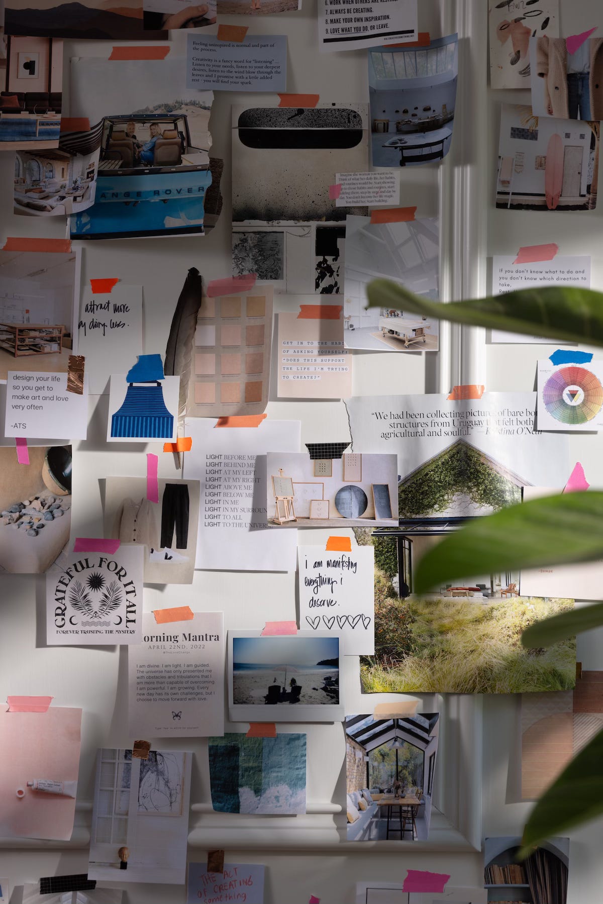 → A corkboard, foam board, or canvas → Scissors + adhesive (pins or glue — I recommend pins so you can swap images as your year evolves) → Printed images & photos → Magazines (vintage Domino, current InKind are personal favorites) → Colorful or patterned paper scraps — envelope liners, pages from old books, coasters, business cards, anything with an interesting texture and color → Markers, paint, or pens for words