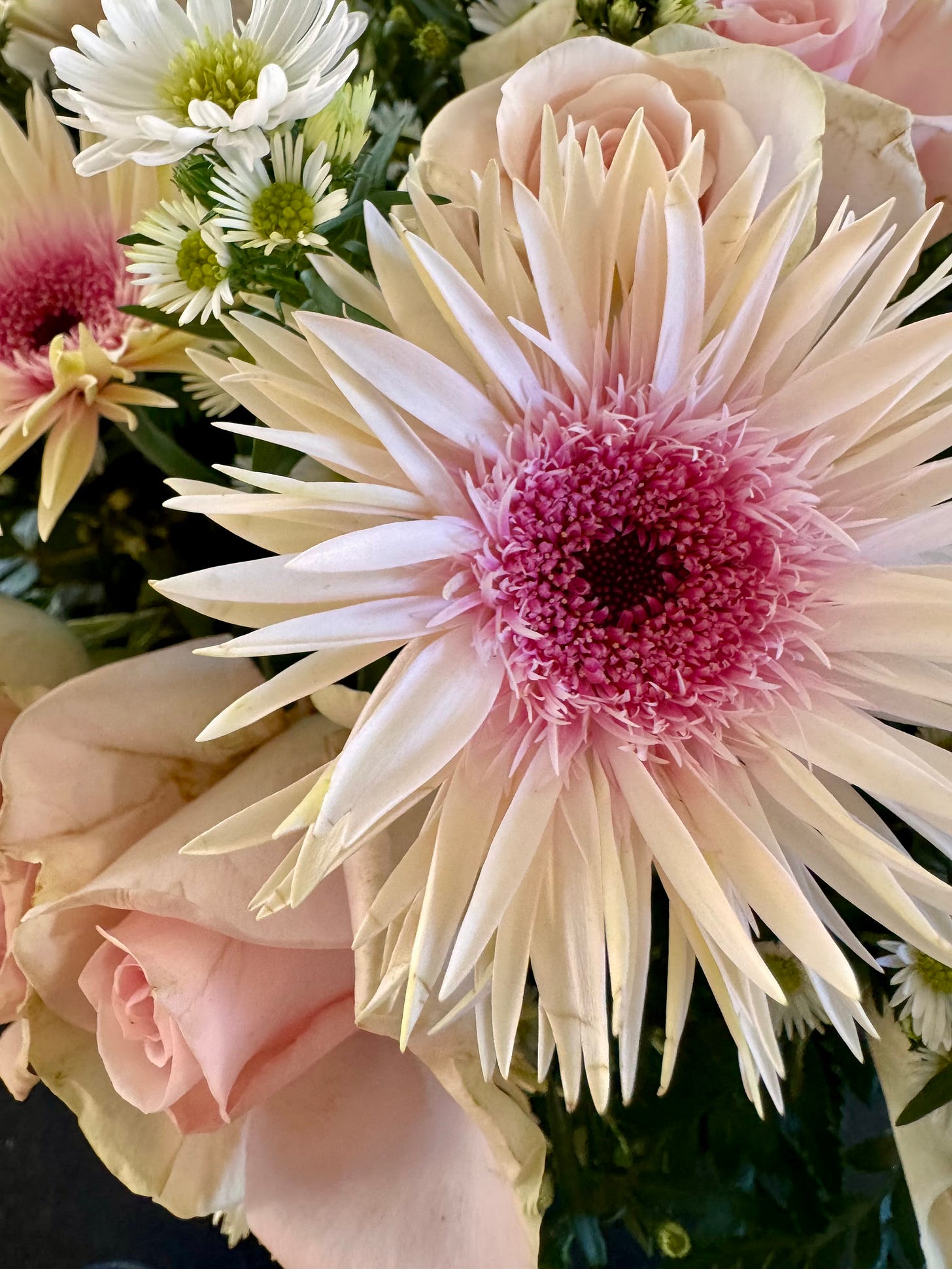 A spider chrysanthemum arrived in a grocery store bouquet this week. Those long, needle-thin petals radiating out like something between a firework and a compass rose, cream at the tips, deepening to the palest blush, then pulling into a center that goes full magenta, almost plum at its darkest point. One flower, moving through four distinct values of the same family. Cream to blush to rose to wine, in the span of a few centimeters. It’s the kind of gradient a painter would labor over and probably overwork. The flower just grew that way. I keep coming back to the center specifically — that concentrated burst of color, how it makes the pale petals around it look even more luminous by contrast. Dark makes light look lighter. I know this. But seeing it done this well is a reminder worth having.